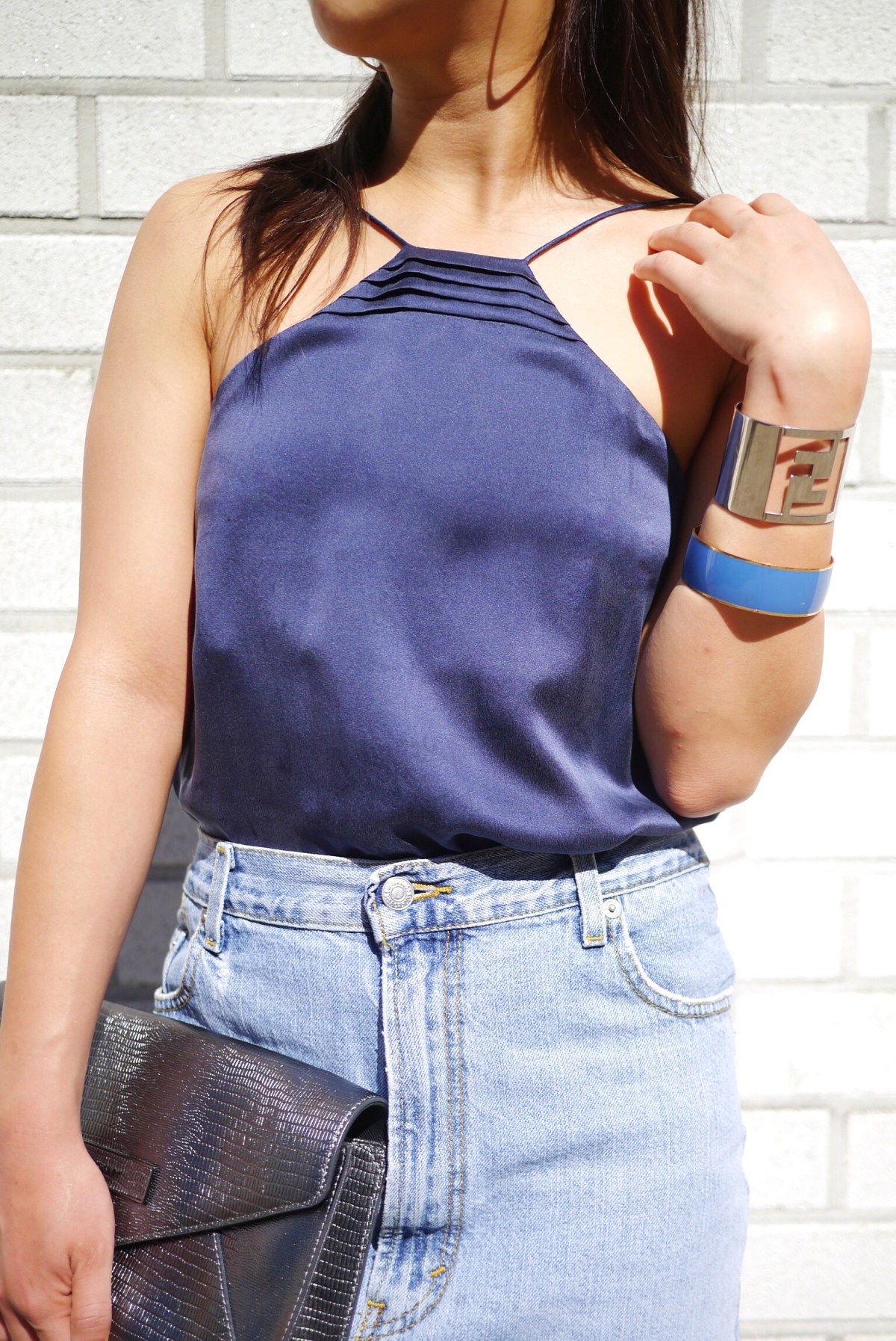 And of course, the top is 100% Utilita State stamp approved – just look at the name! Wear it with the scoop side front over a white button-down and BOOM, you’ve got your day-time office wear. Pro tip: layering a camisole over a white blouse also helps solve that irritating risk of the see-through bra. On the reverse (literally), I’m channelling slight eccentrism inspired by one of my favorite blogs, Man Repeller, when putting together this casual outfit. Tuck into a high-waist denim skirt remade from Vintage Levi’s and throw on a pair of beautifully bold booties. Oo la, I feel so summer in New York.